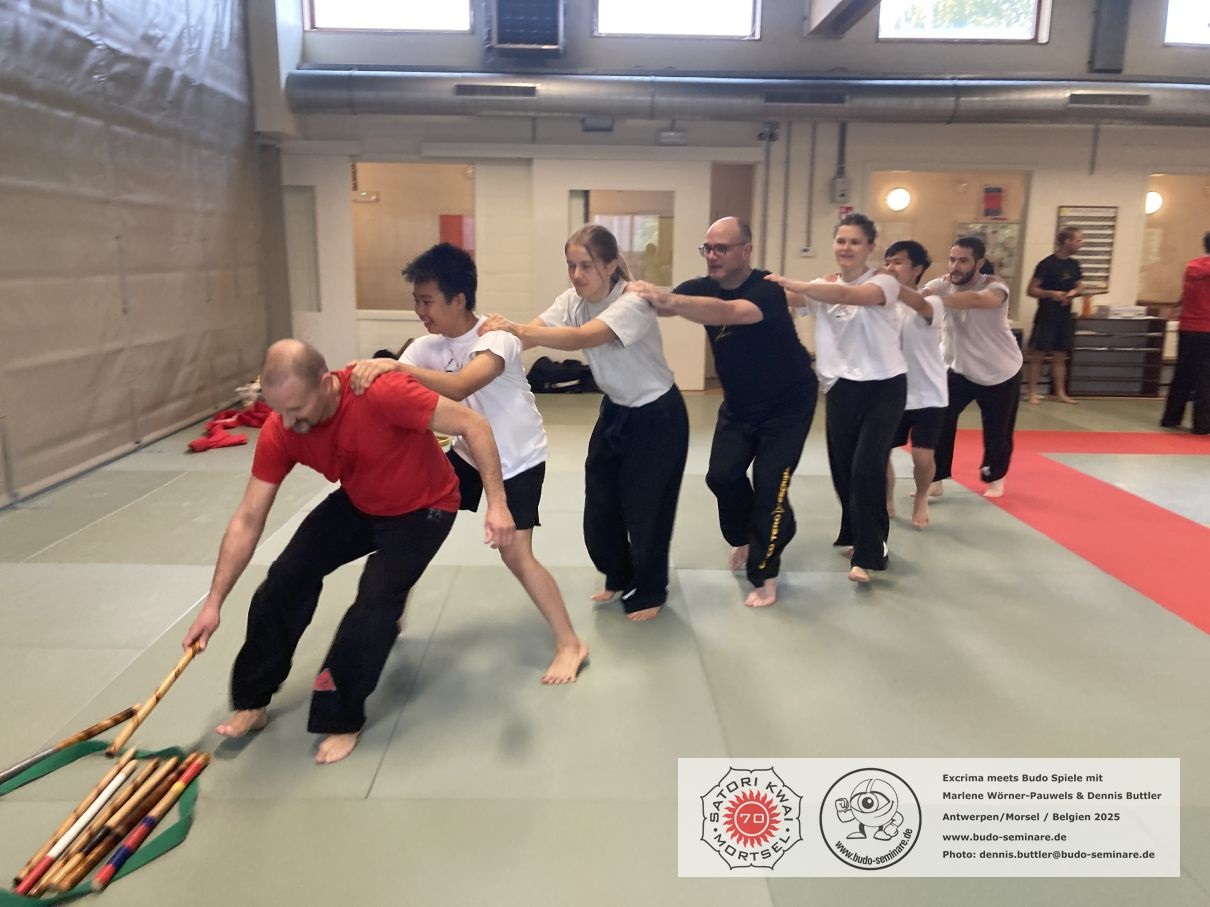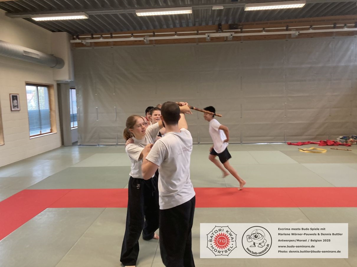 Escrima meets Budo Spiele beim Satori Kwai Mortsel / Belgien. Zum Escrima Training von Marlene Wörner-Pauwels gab es begleitend zum Techniktraining passende Spiele dazu. So wurde viel gelacht, geschwitzt und mit Freude Techniktraining absolviert.