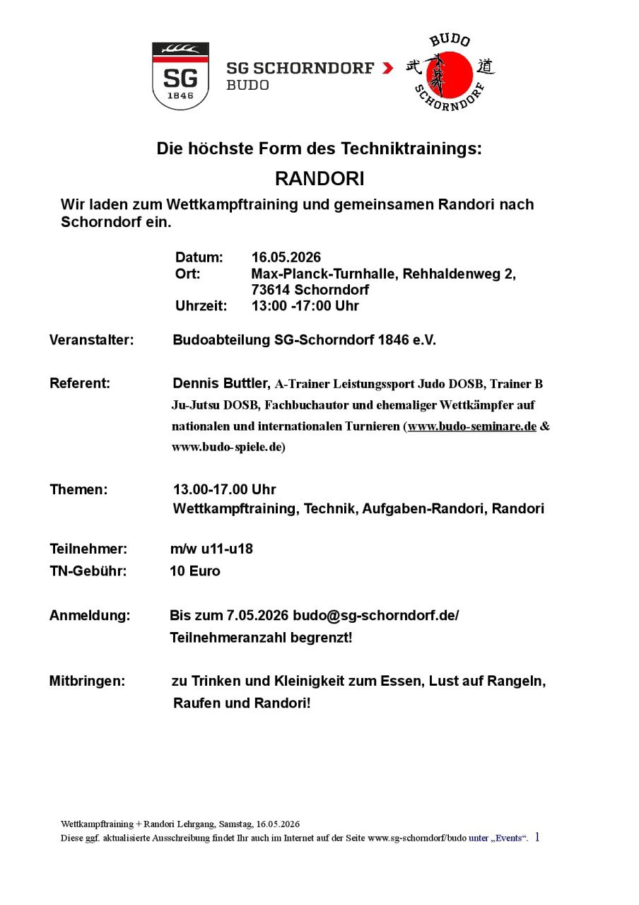 Am 16. Mai gibt es in Schorndorf/Baden-Württemberg viele coole Wettkampftechniken kombiniert mit vielen Randori und Aufgaben-Randori - inklusive Budo Spielen. Für Judoka und Ju-Jutsuka offen - meldet Euch bei Francisco de la Fuente an. Freue mich über ein Wiedersehen und das Kennenlernen vieler neuer Sportsfreunde!